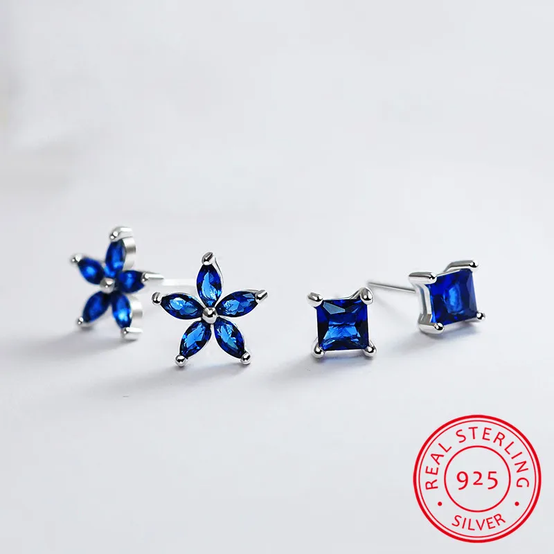 Name: Pendientes de lujo para mujer, de zafiro azul Natural, Plata de Ley 925, aretes de boda para mujer, aretes de tuerca de flor cuadrados Vintage
